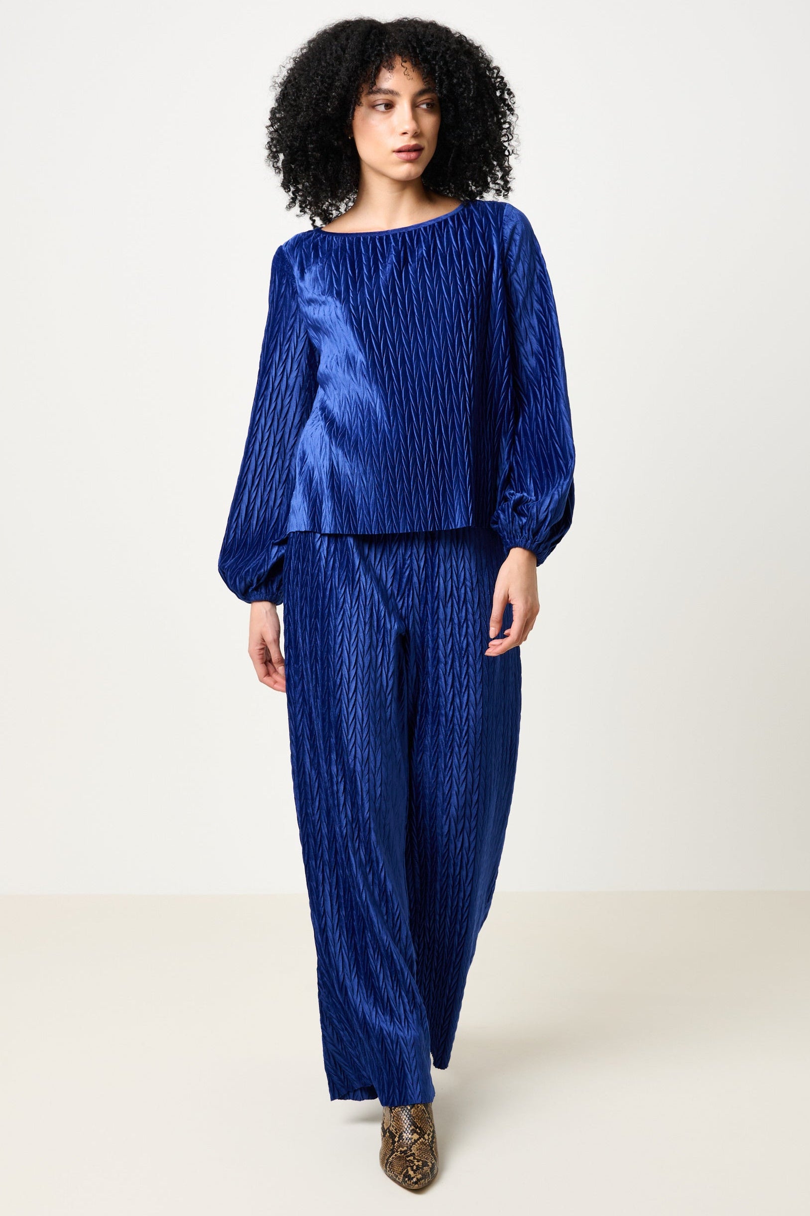 Forget everything you thought you knew about party wear. The Aba Velvet Pleat long sleeve top in a deep cobalt blue rewrites the rules with its relaxed fit, luxe pleated velvet fabric, and dramatically voluminous sleeves. Pair with the Melvin trousers for an effortlessly chic, laid-back luxury moment that proves dressing up doesn't mean dressing stiff.