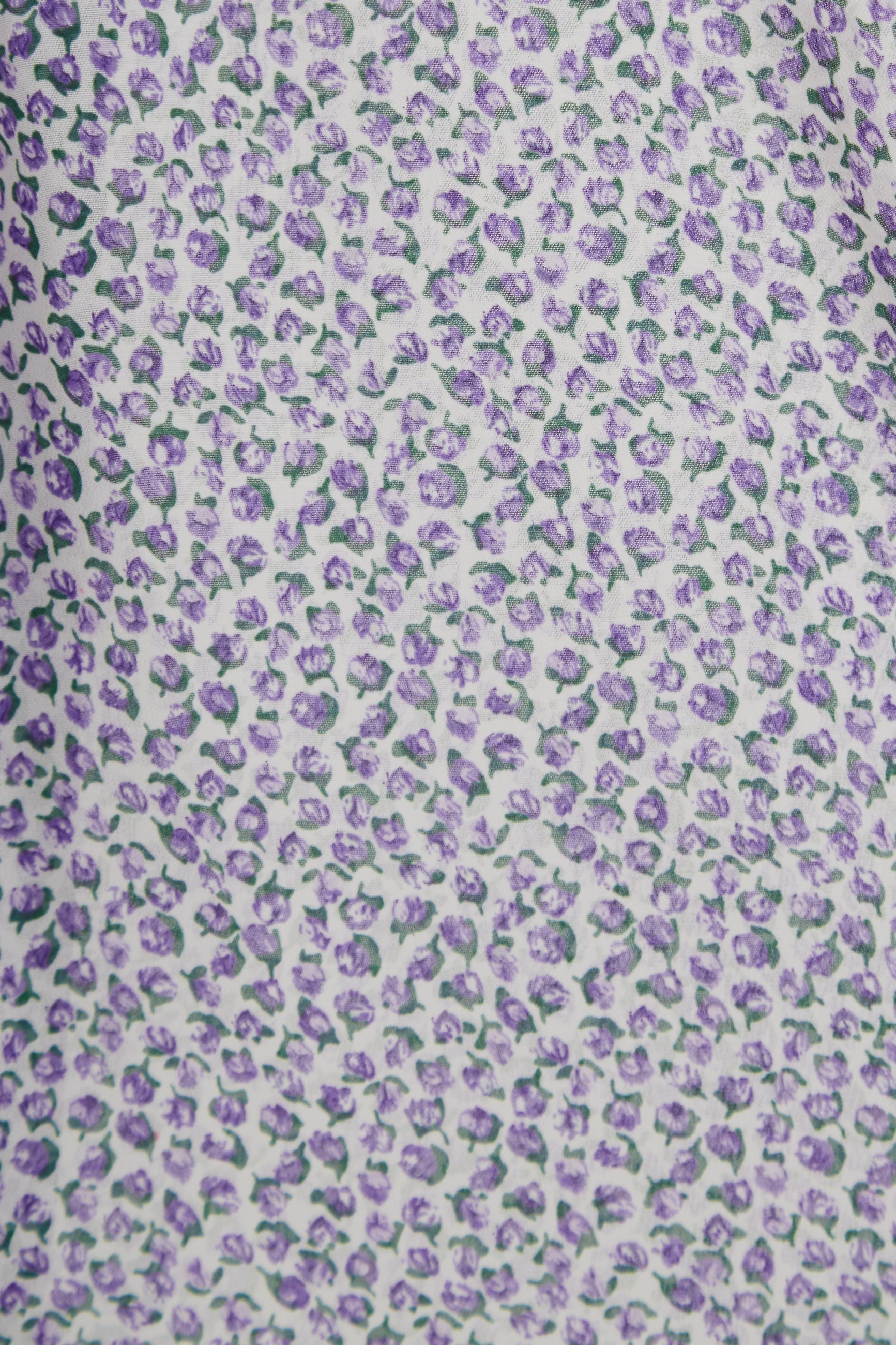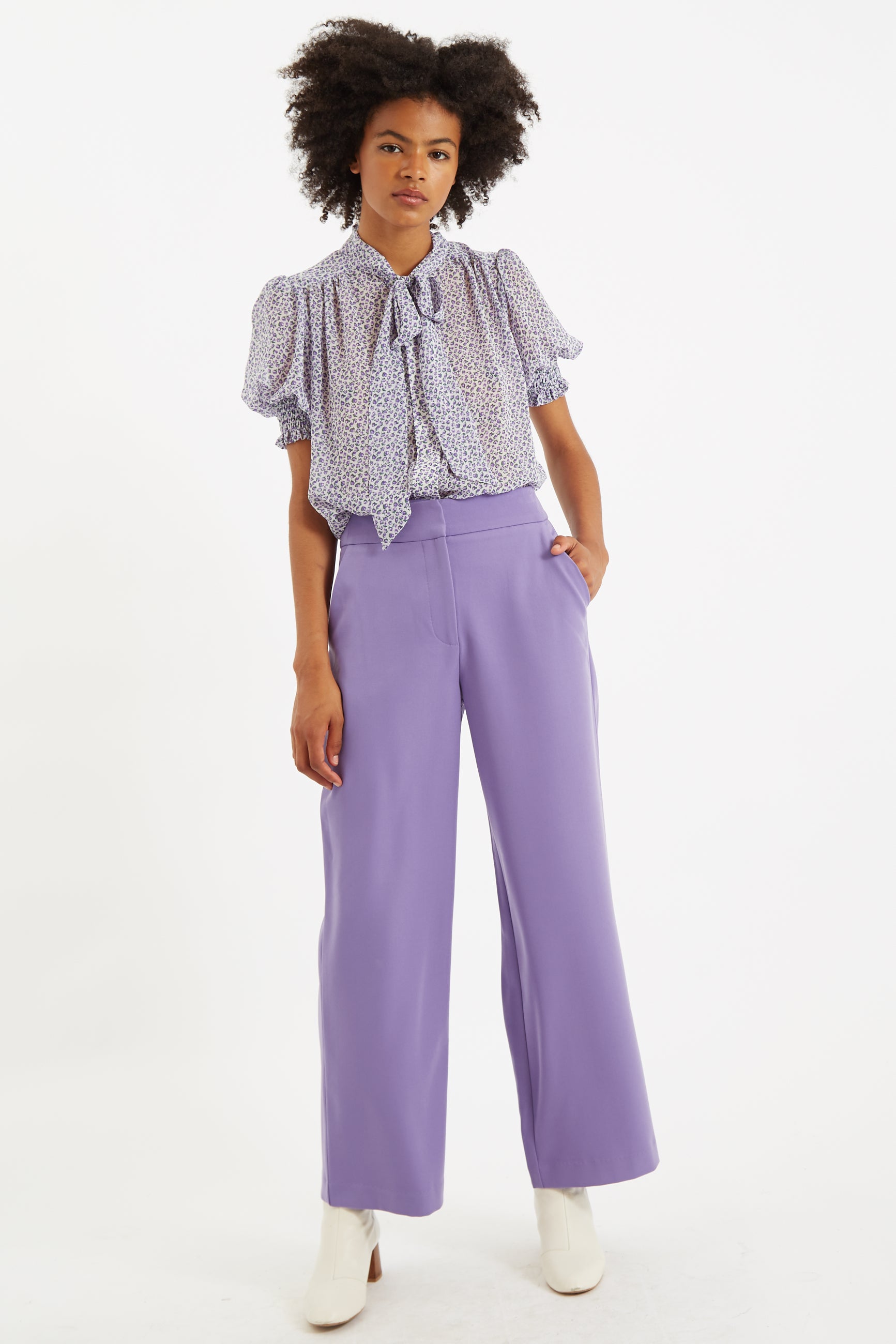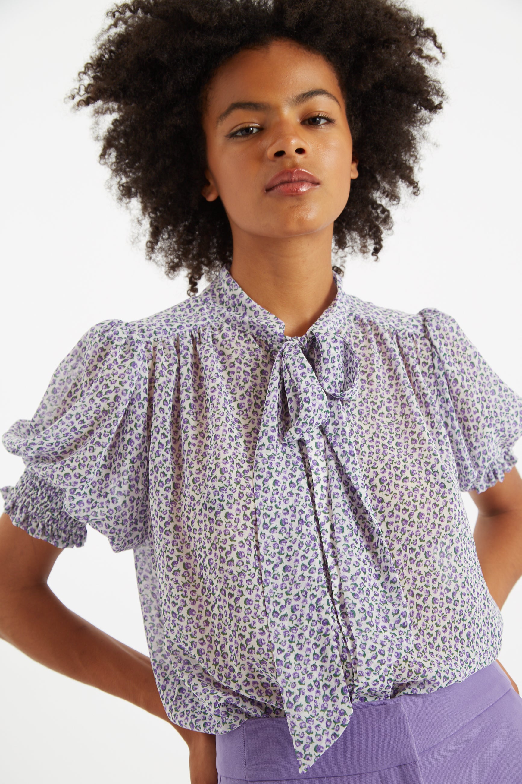 This oh so cute blouse worn here with the Elina trouser in lilac makes a statement outfit ideal for a special occasion. For a more weekend vibe pair with your favourite denims. Crafted in a semi transparent printed georgette fabric. Features shirred elasticated cuff sleeves, gathered back and front yokes, concealed front opening and pussy bow tie neckline.