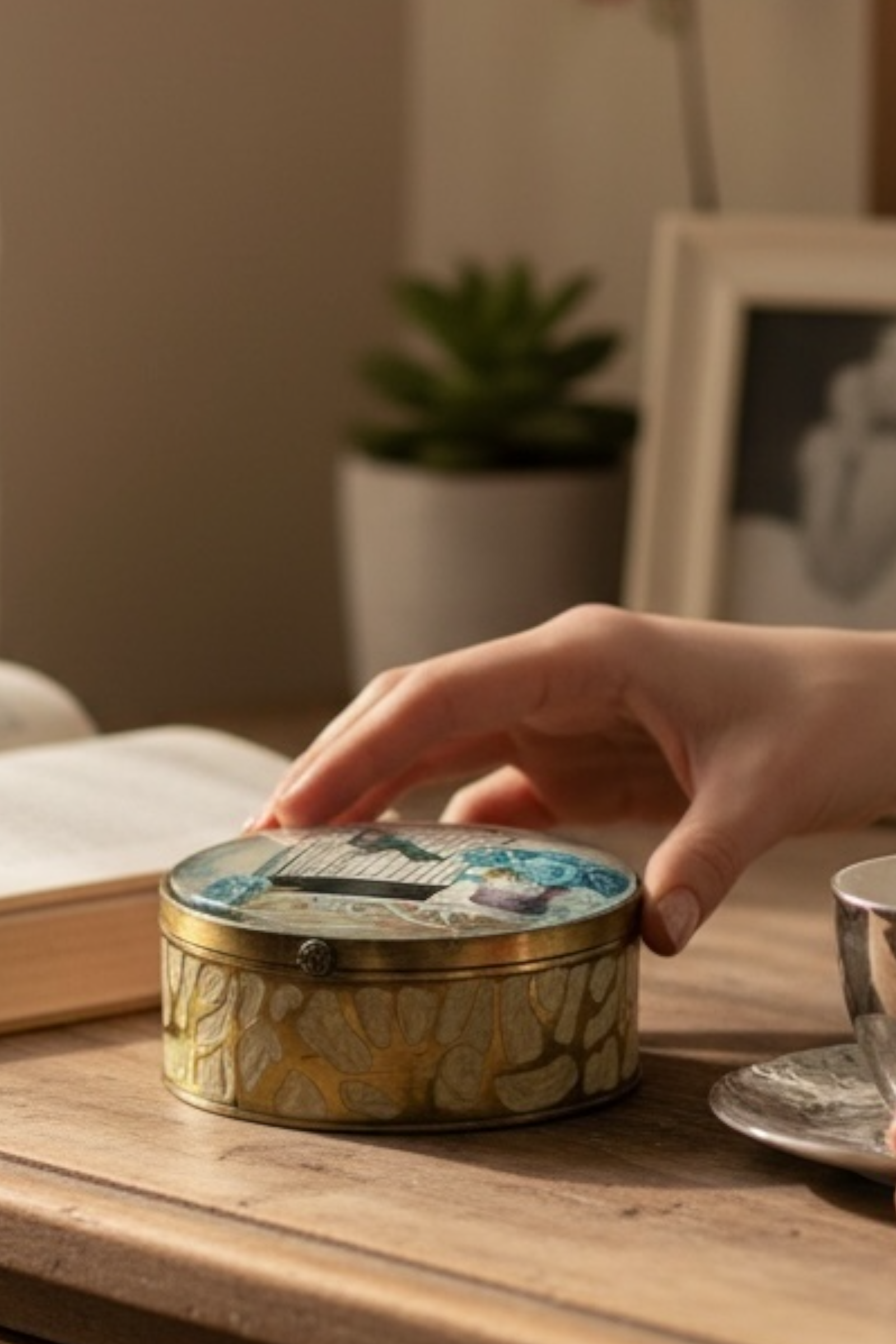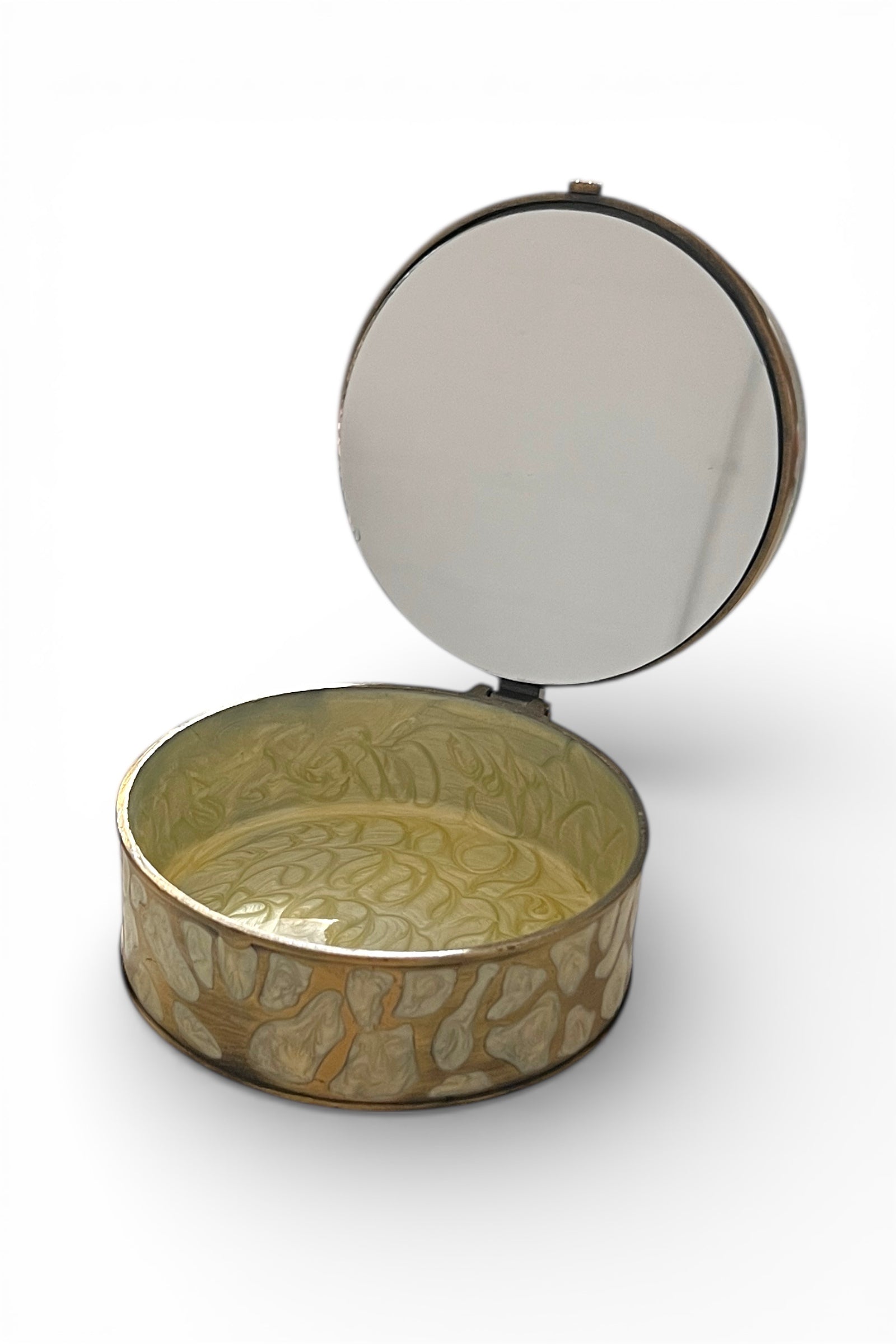 This vintage-inspired trinket box features robust enamel craftsmanship topped with a heavy printed glass dome showcasing an exquisite birdcage illustration. Pop the lid open and discover a mirror, perfect for fixing those earrings.