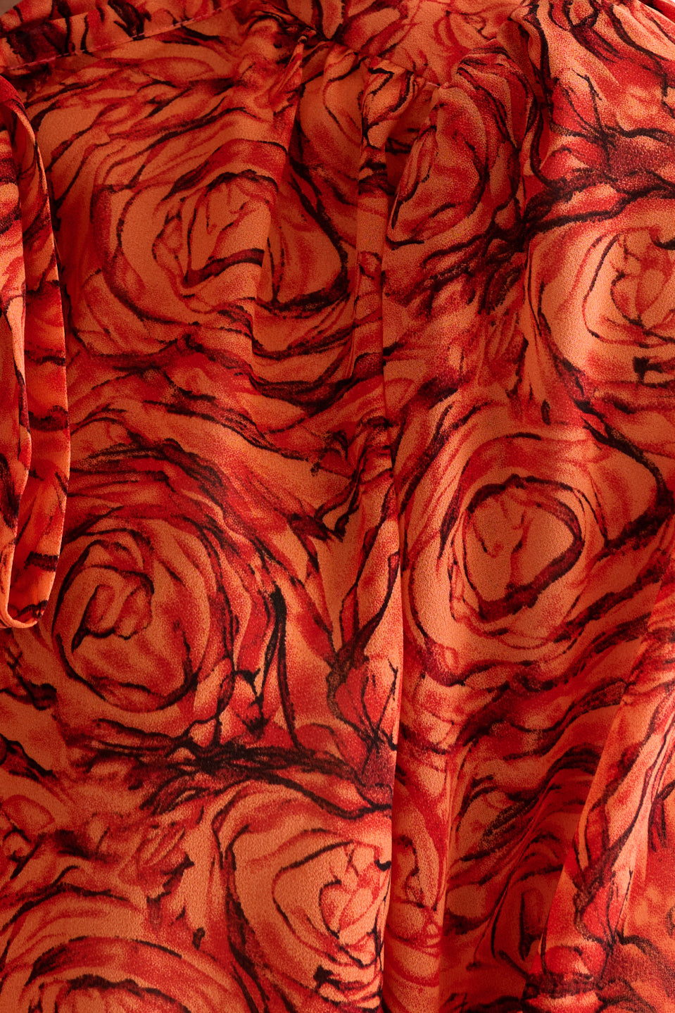 The Boo Rosechild tie neck blouse in soft apricot subtle sketchy rose print. Features voluminous sleeves and on-trend tie neckline, crafted in a premium soft-handle georgette for a lightweight, elegant drape. Easily blending classic femininity with contemporary style for a polished, versatile wardrobe essential.