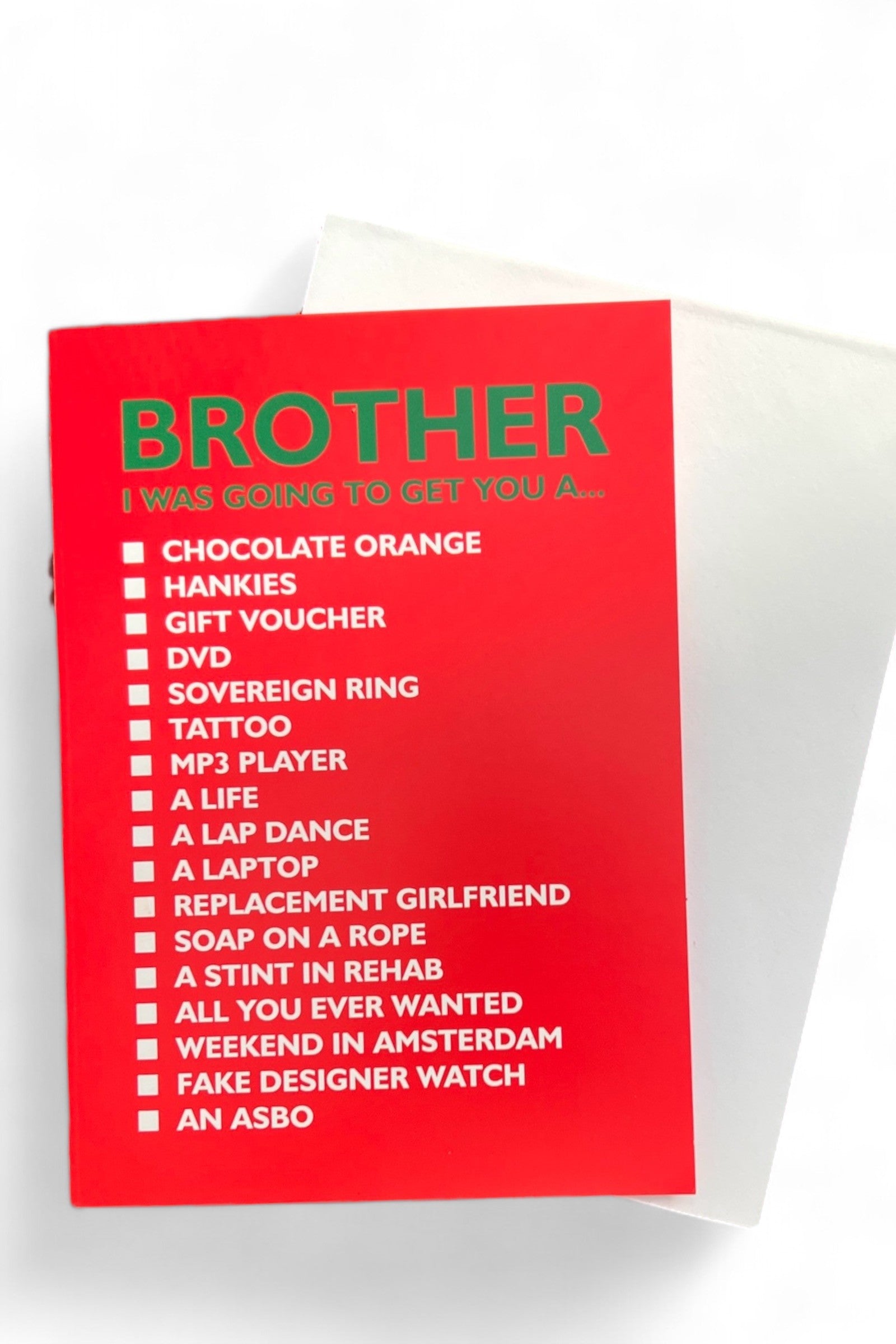 Great Christmas card for a fun loving brother featuring a present list that might or not happen, note tick boxes provided! Designed and printed in the UK. The card's features a large Merry Christmas inside. Includes a white envelope .