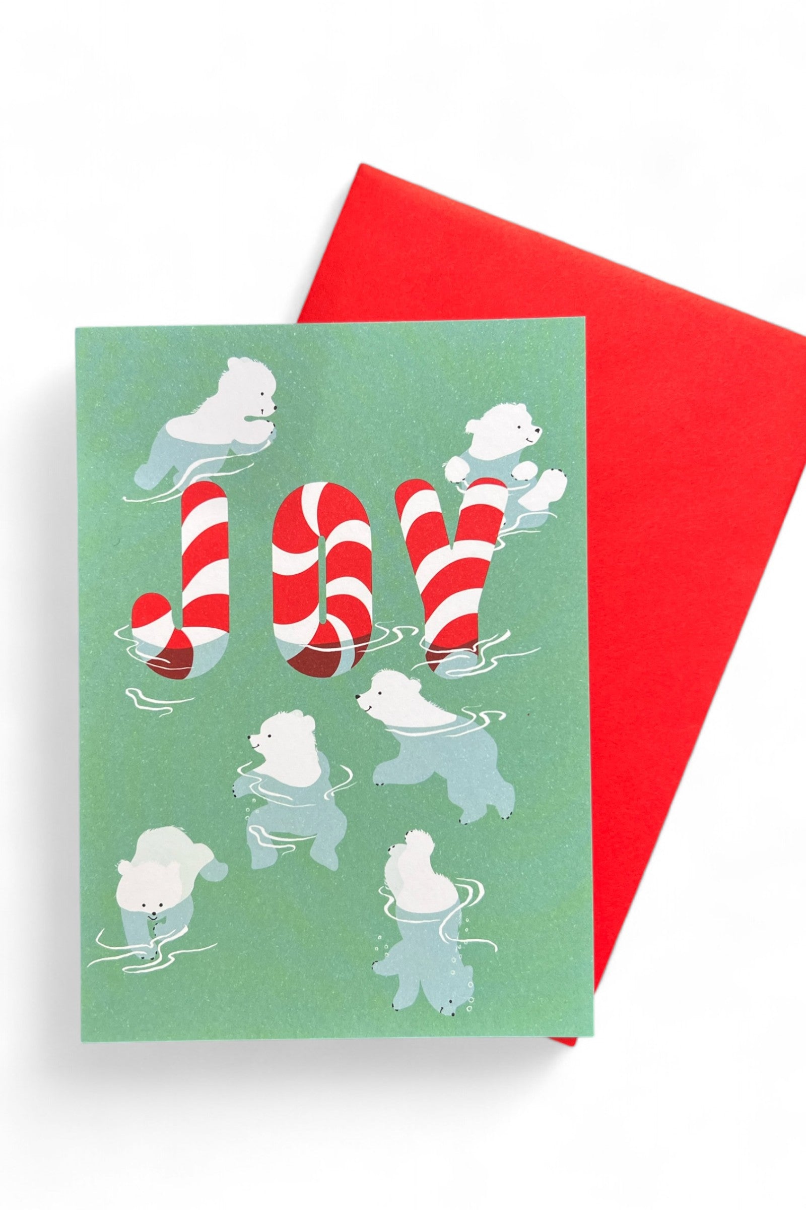 Candy canes and swimming polar bears bring JOY. This Christmas card is designed and made in the UK. The card's blank interior allows you to write your own message. Includes a bright red envelope to make it extra eye-catching.