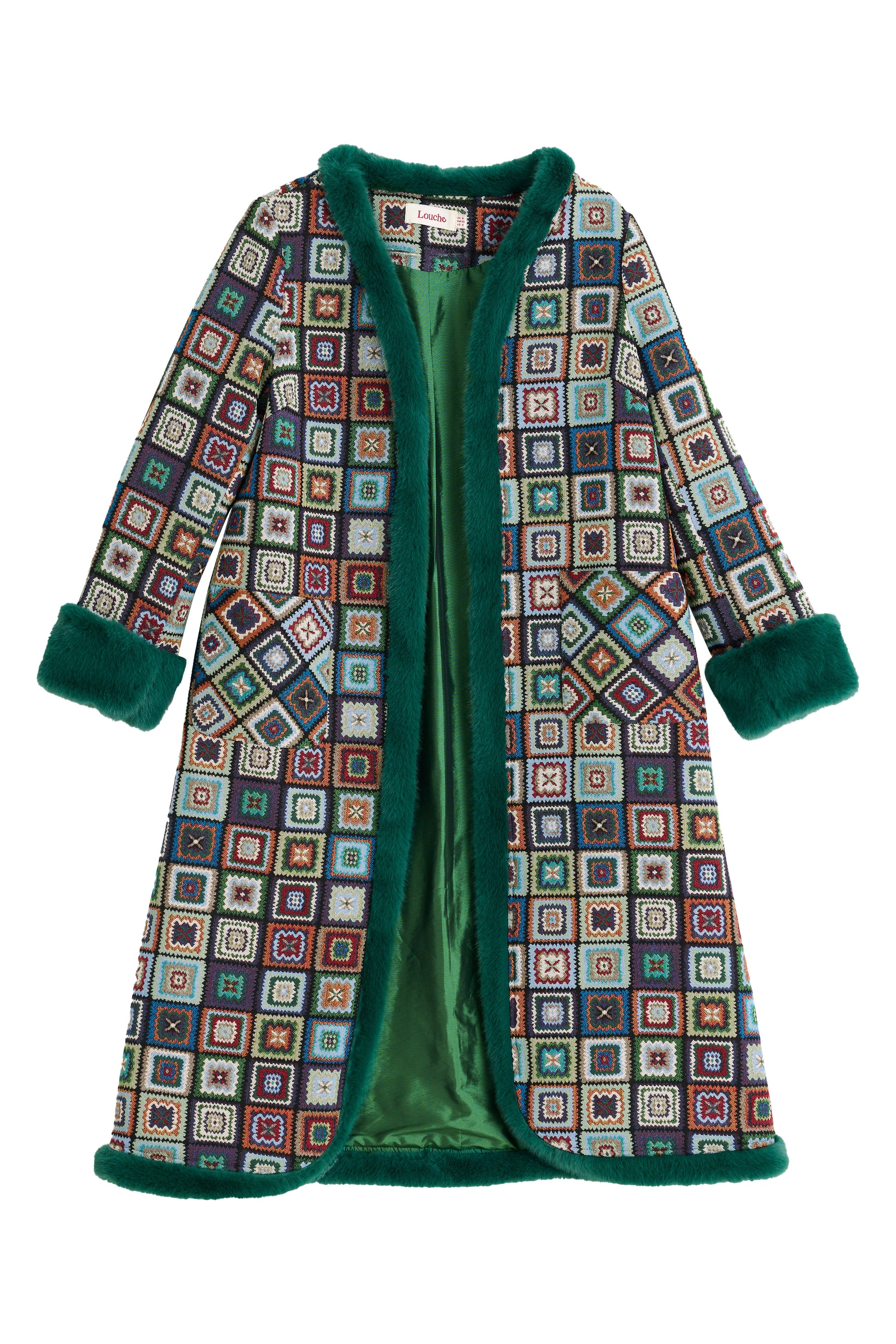 Introducing the Delphia 70's Patch Jacquard fur trim coat. This statement piece features a unique woven crochet patchwork design jacquard and is finished with teal fur trim around the neck, hem, and cuffs, adding style and retro flair to your look.