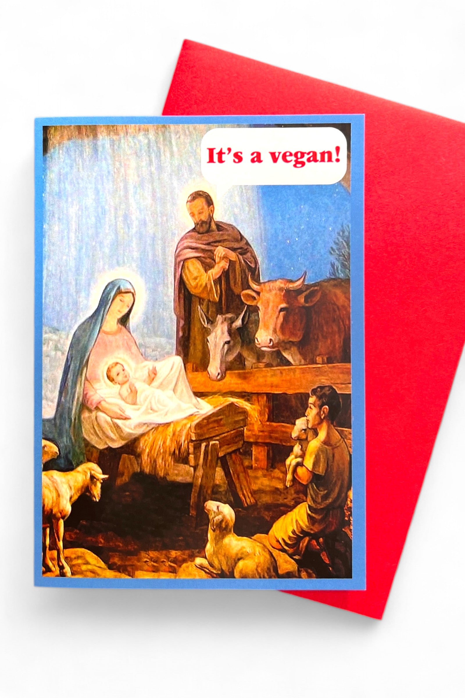 This amusingly card could be an ideal Christmas card to send to your favourite vegan. This card is made of sustainable card and designed in the UK. The card is blank inside with an bright red envelope included.