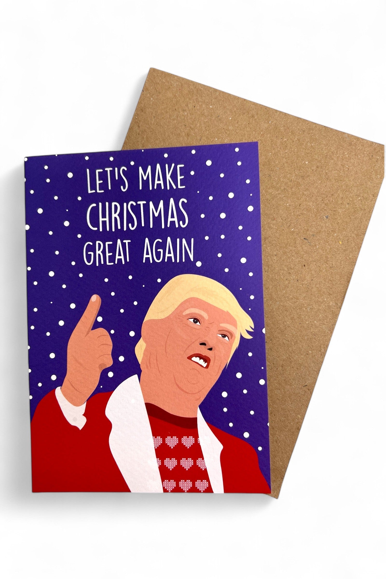 We've brought him back again, We thought Donald needed to make Christmas great again! Designed and made in the UK, The cards blank interior allows you to write your own message. Includes a kraft envelope.