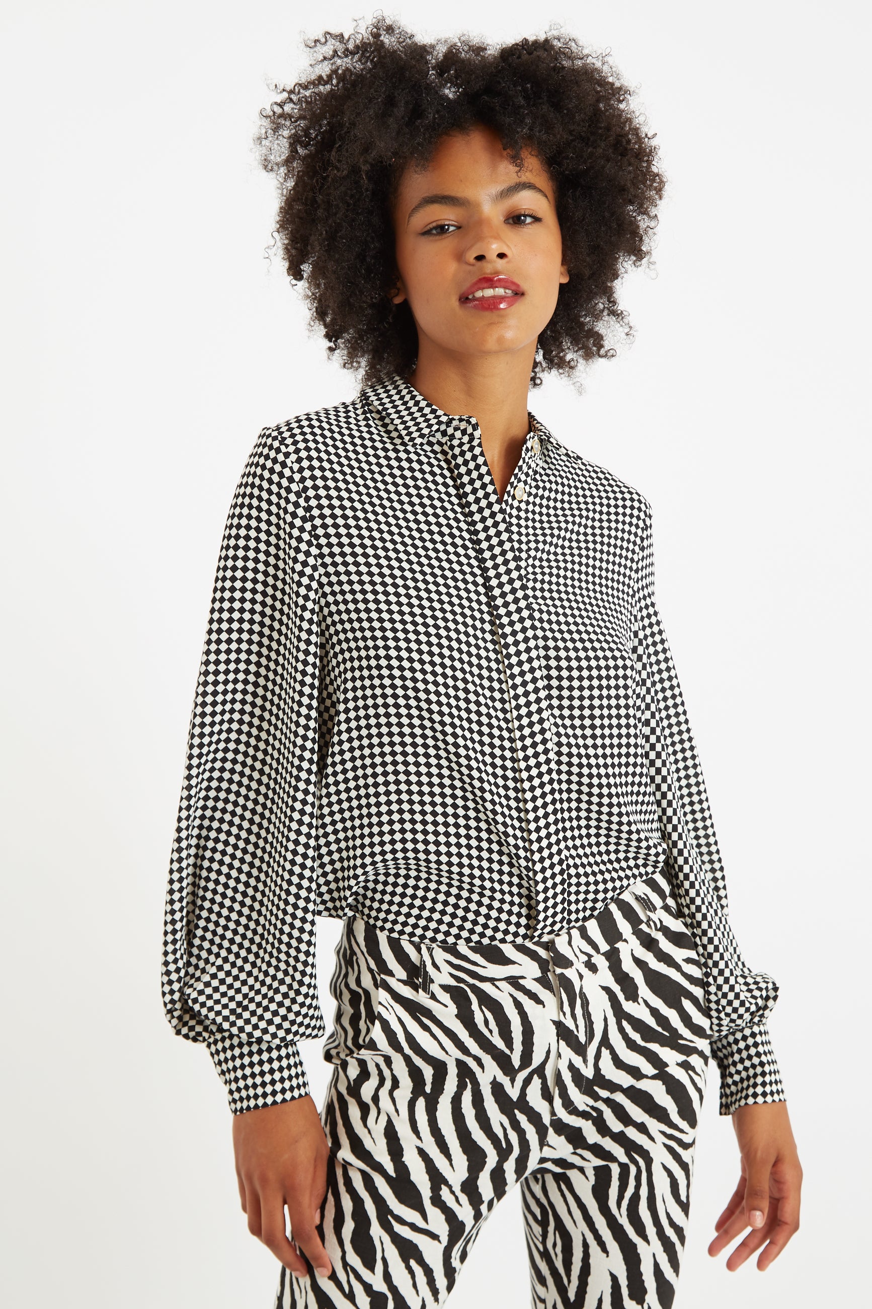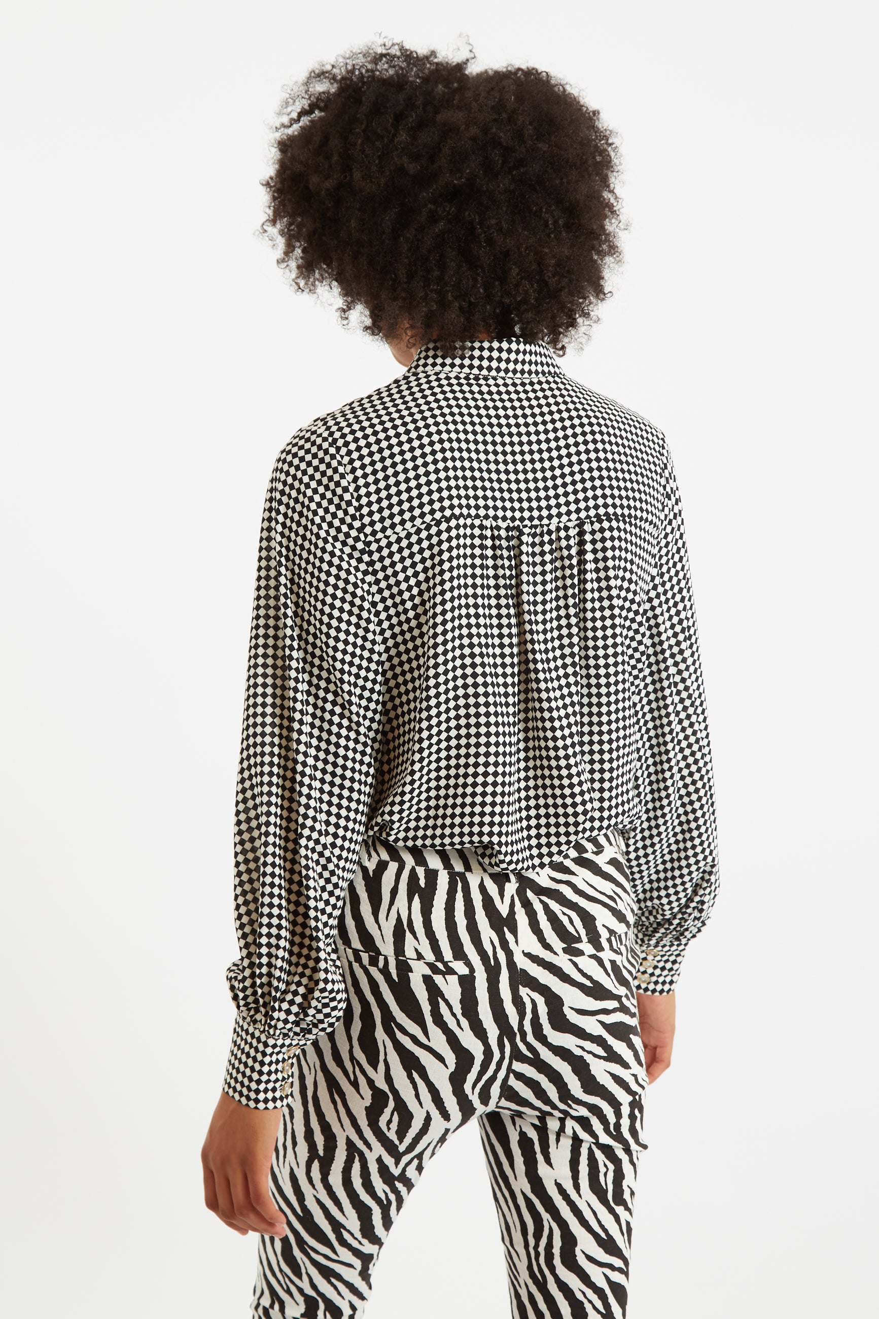 The Byron shirt crafted in a 70's inspired graphic print is such a wardrobe staple. Made from a soft handle polyester it elevates any outfit. Featuring wide sleeves with deep cuffs, delicate gold rimmed buttons and a hidden front placket.