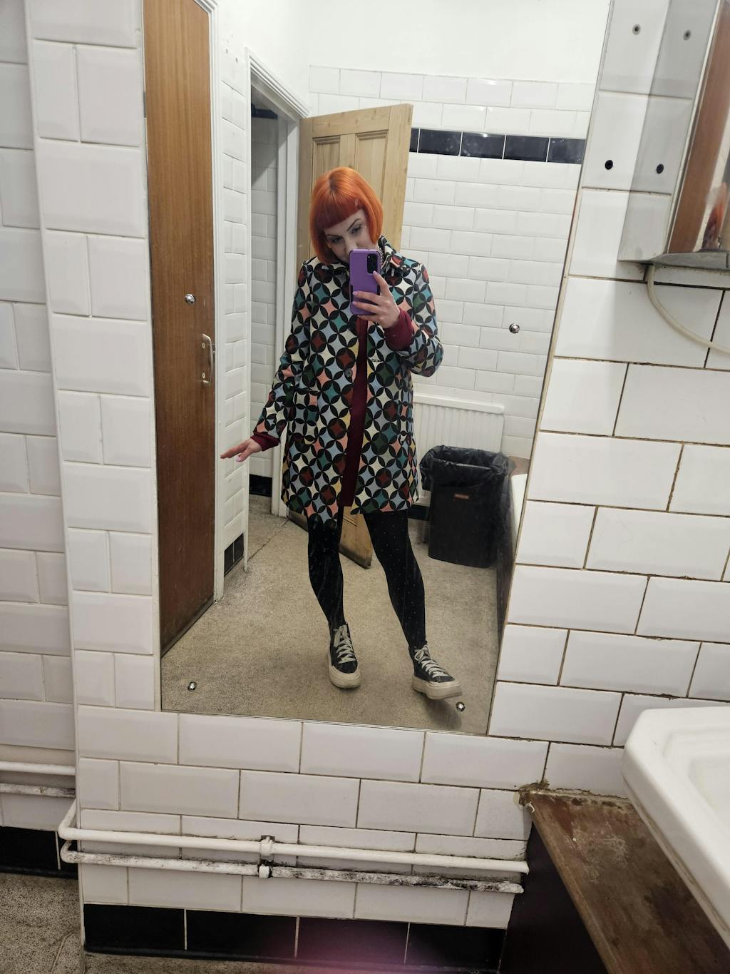 The Dryden is a retro styled, versatile A-line coat featuring a button fastening and patch pockets. Reimagined in an intricate woven jacquard fabric with a circle design inspired by the 60's. A statement piece that will level-up any outfit!