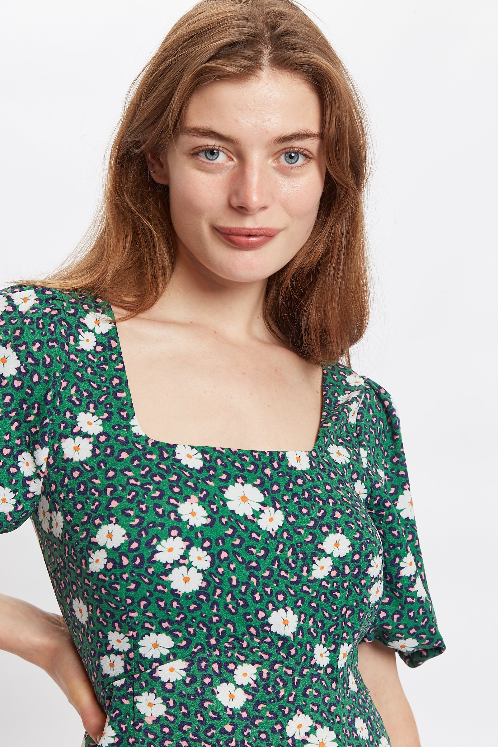 Louche Nadine Roaring Daisy Print Square Neck Balloon Sleeve Midi Dress - Green