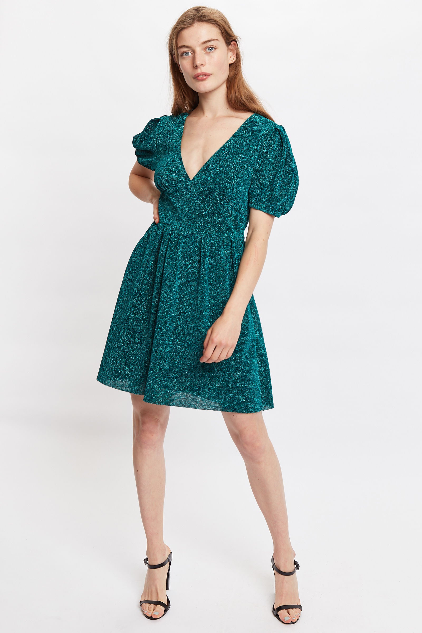 Crafted in a Lurex jersey this mini dress will light up any party. Featuring a deep V neck and statement puff sleeves.