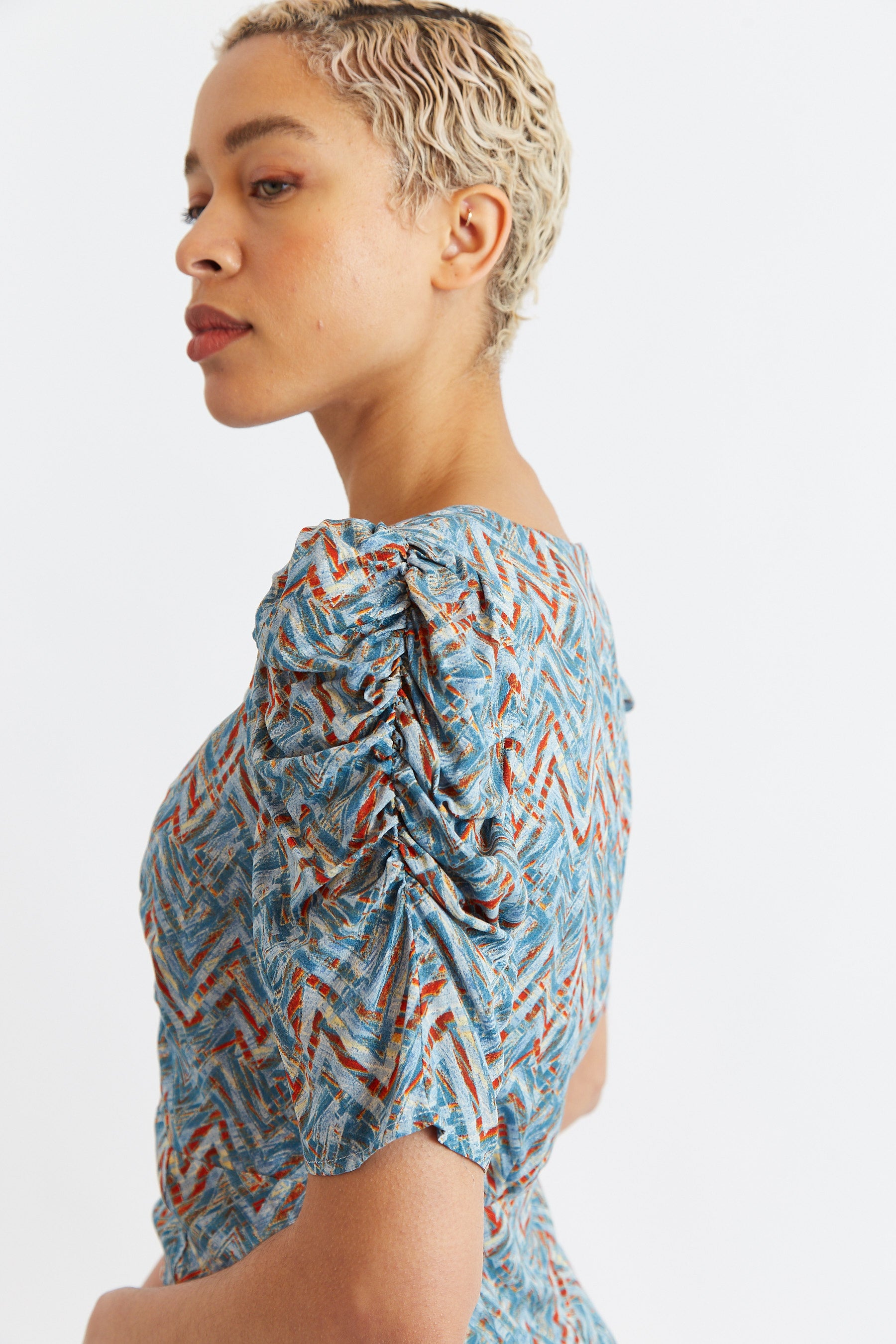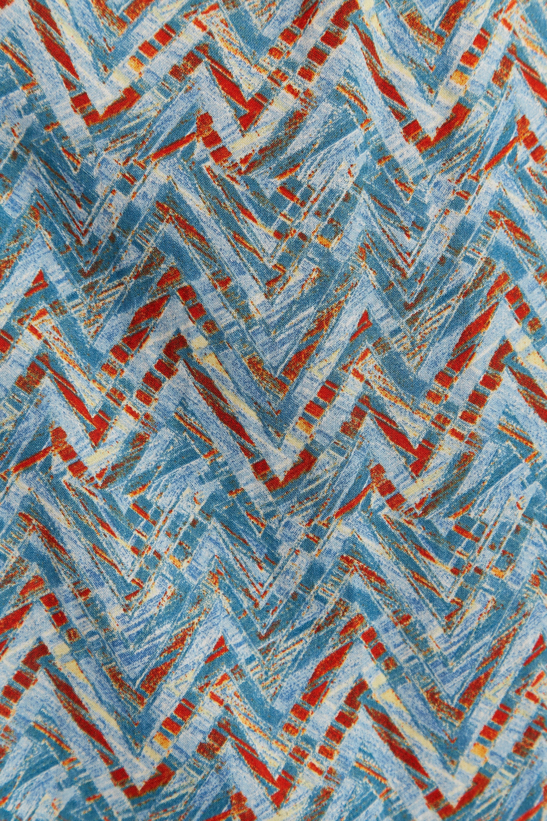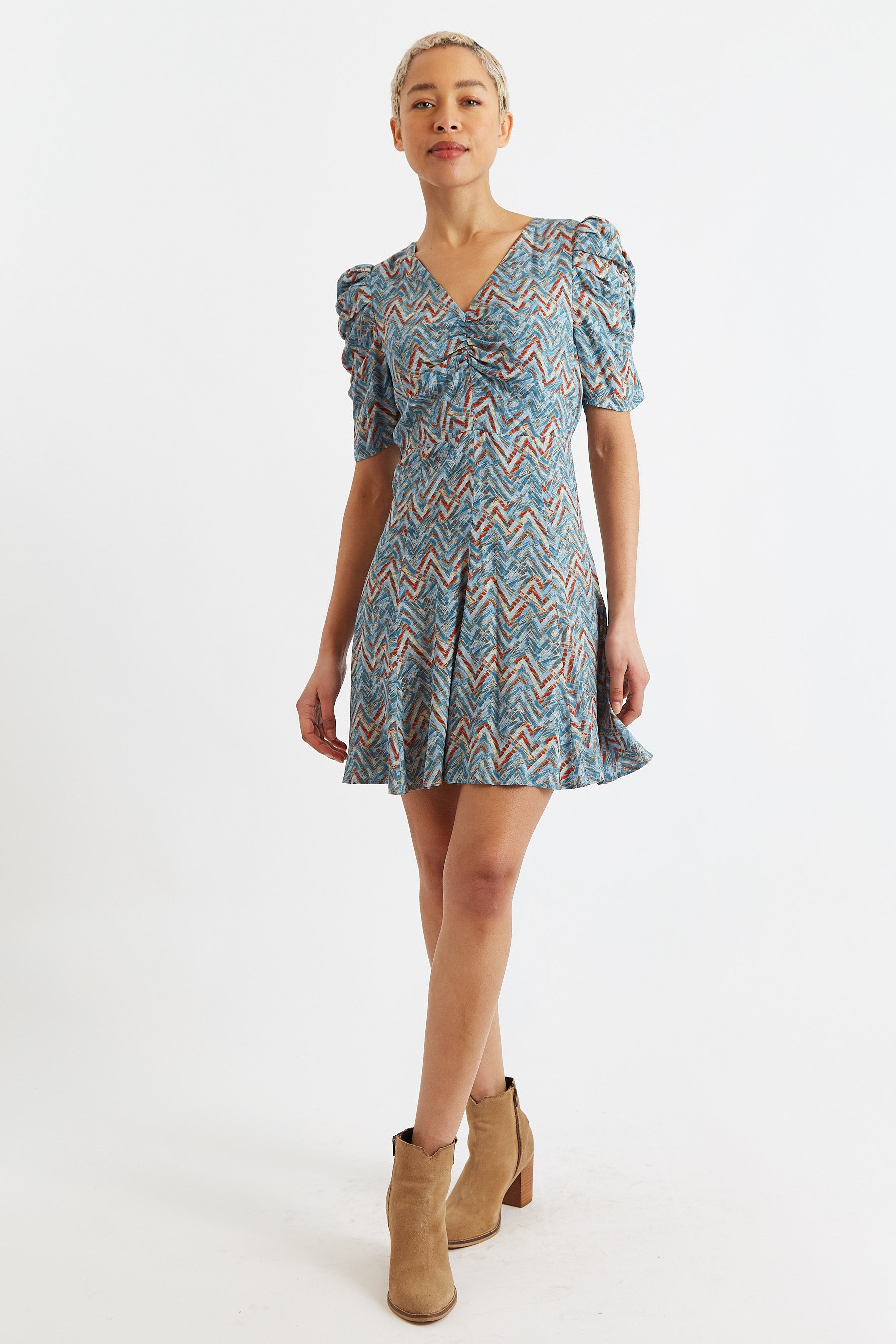 Introducing the Margot Art Attack print mini tea dress. Crafted in an eye-catching geometric chevron print in a cool duck egg, accented with pops of camel and red, this cute V-neck mini dress is just so easy to wear. Featuring short shirred puff sleeves and a shirred front bodice detail. Pair with boots or trainers for an effortless look.