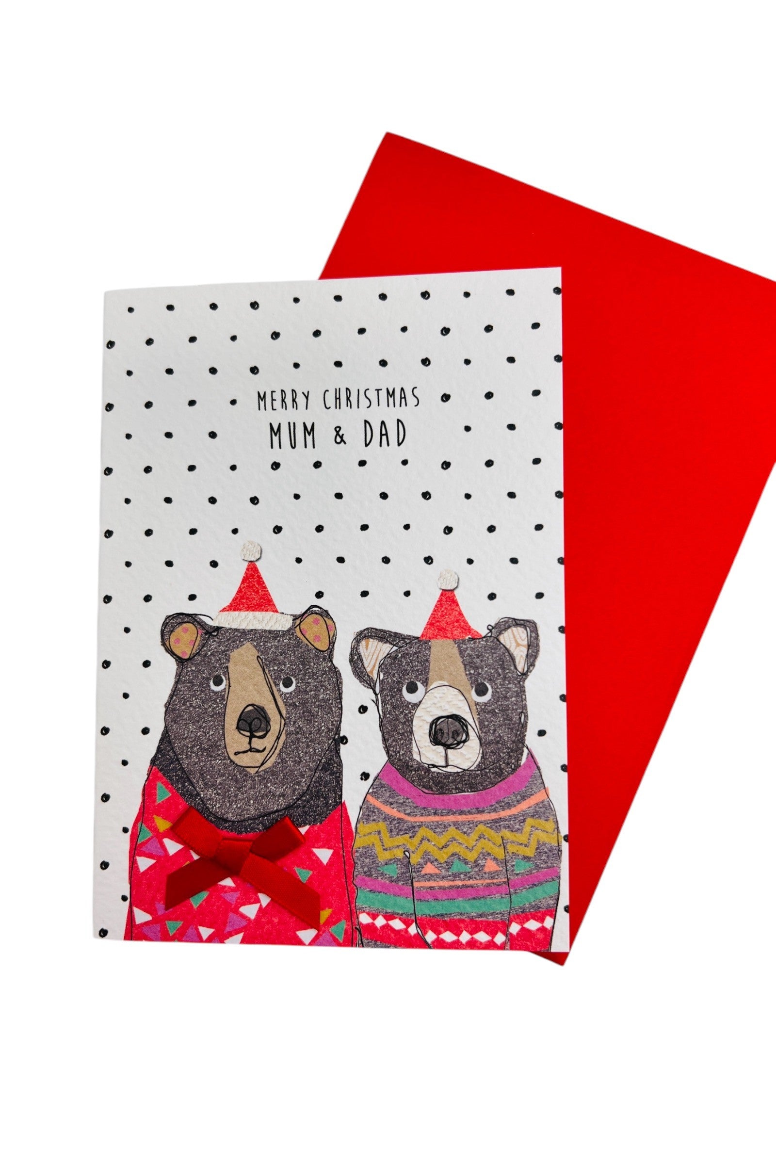 A charming illustrated Christmas card for Mum and Dad. Printed, hand decorated with ribbon bow and designed in the UK. The card is blank inside with a bright red envelope included.