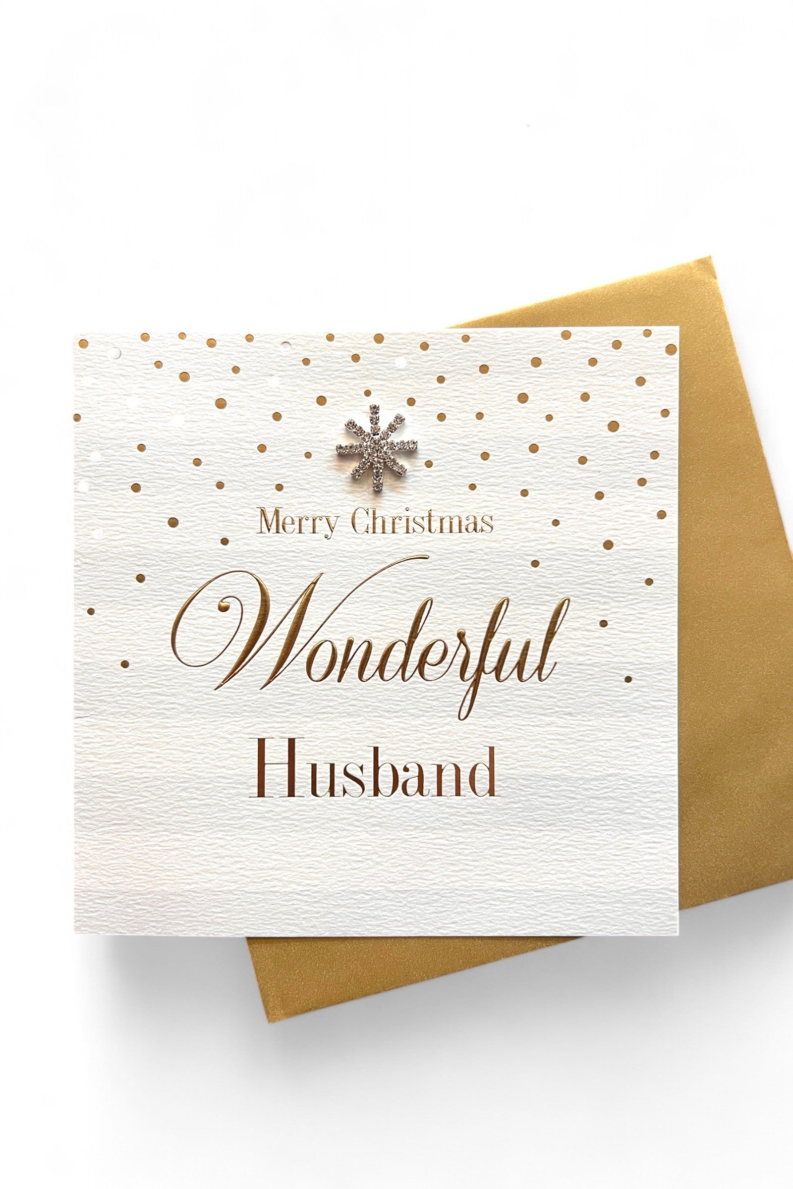 Send your husband an extra special card this Christmas. Made of high-quality embossed, gold foiled card is hand-finished with a sparkling crystal star ,proudly made in the UK. Blank inside for your own personal message with a gold envelope.