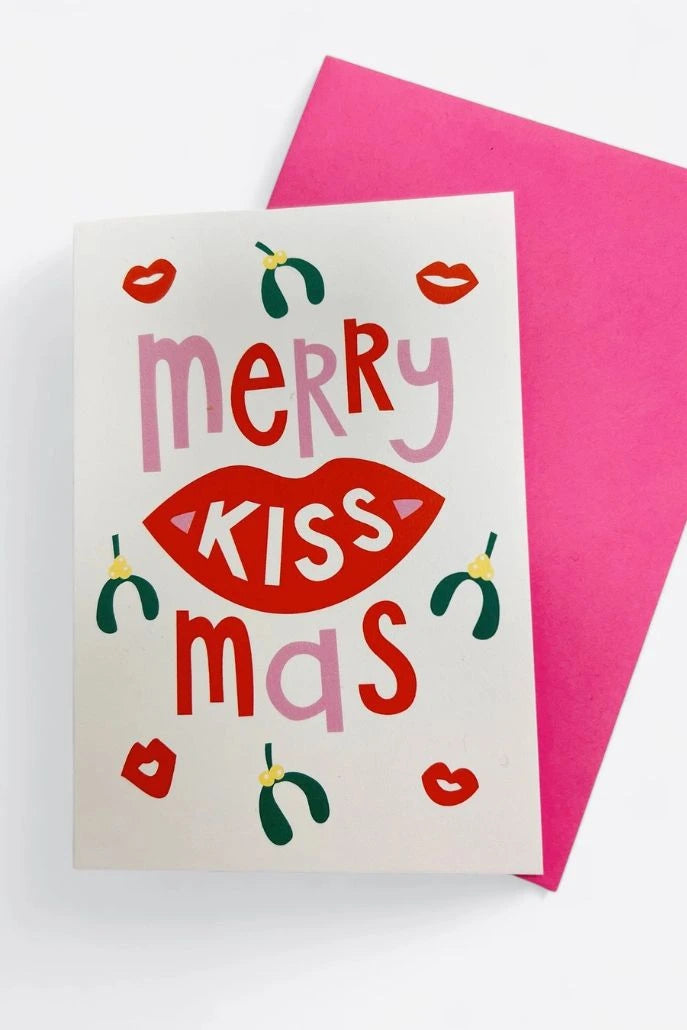 Spread some holiday cheer with our Merry Kissmas Christmas card! This modern, brightly coloured card features a unique illustration that will make anyone smile. Perfect for sending your warm wishes this holiday season.