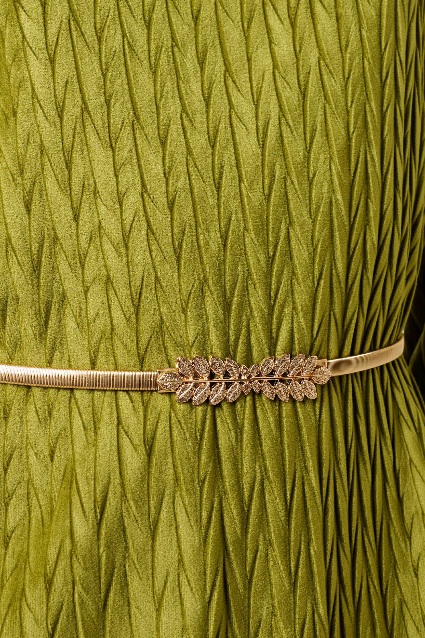 Slip into disco-inspired elegance with the Milene Velvet Pleat Midi Dress. This stunning kiwi green column dress features voluminous Studio 54-style sleeves finished with elasticated cuffs The dress arrives complete with a retro style elasticated gold leaf belt that cinches the waist and adds a touch of added glamour. Perfect for making a statement at evening events or when you're craving that retro-luxe vibe.