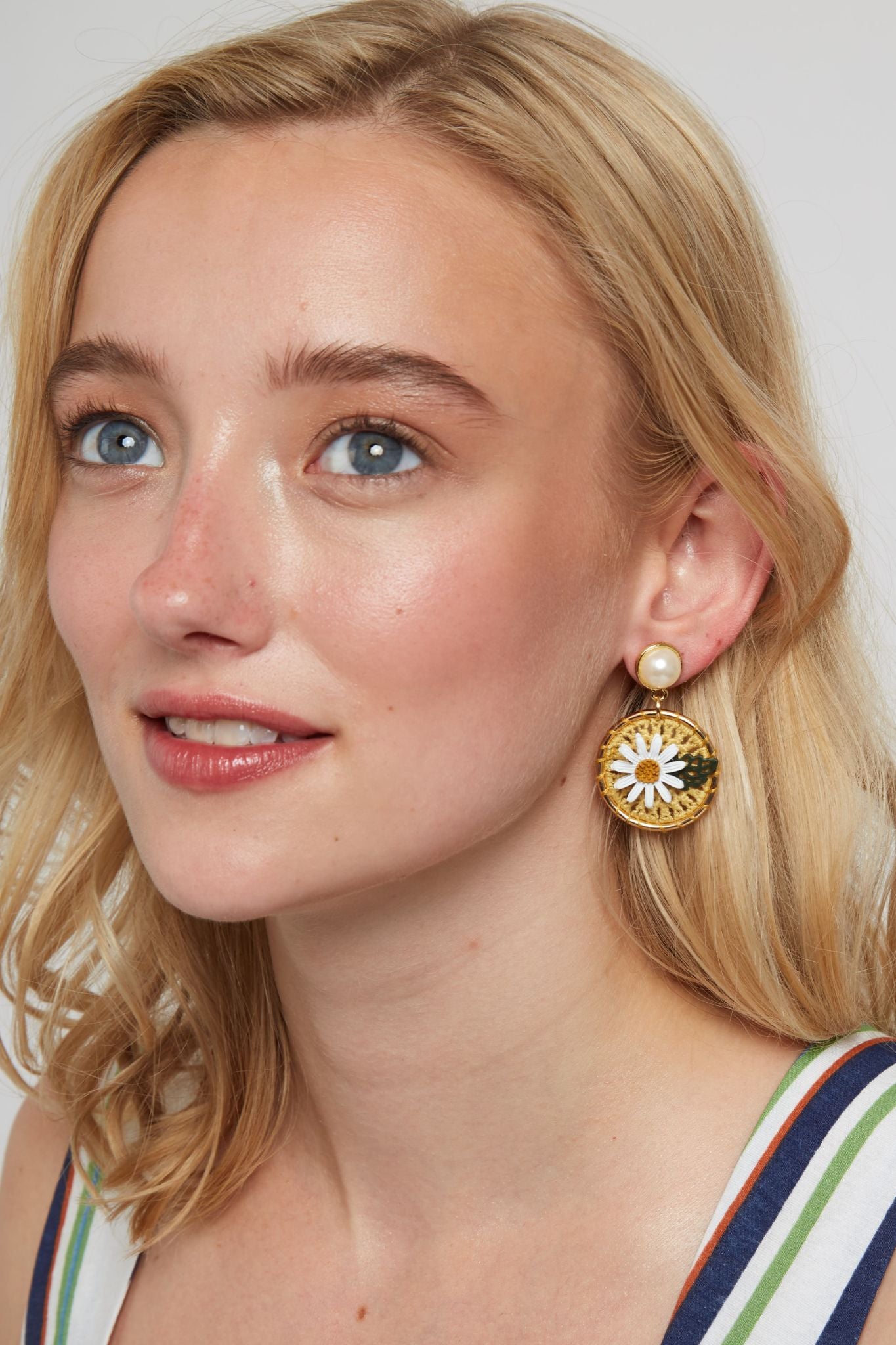 Add a playful touch to your summer style with the Miriam Daisy Drop Earrings. Featuring delicate pearl, natural raffia, and charming relief daisies, these earrings bring a fresh, sunny vibe to any outfit. Perfect for brightening your look on warm days and capturing the carefree spirit of the season.
