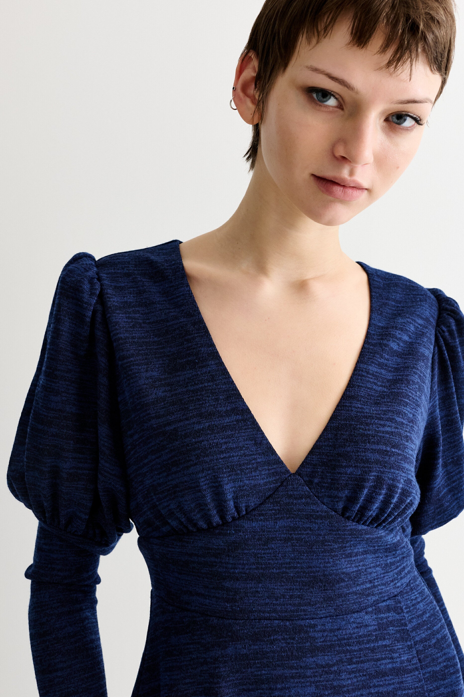 Moa Sustainable Marl Puff Sleeve V Neck Midi Dress - Navy