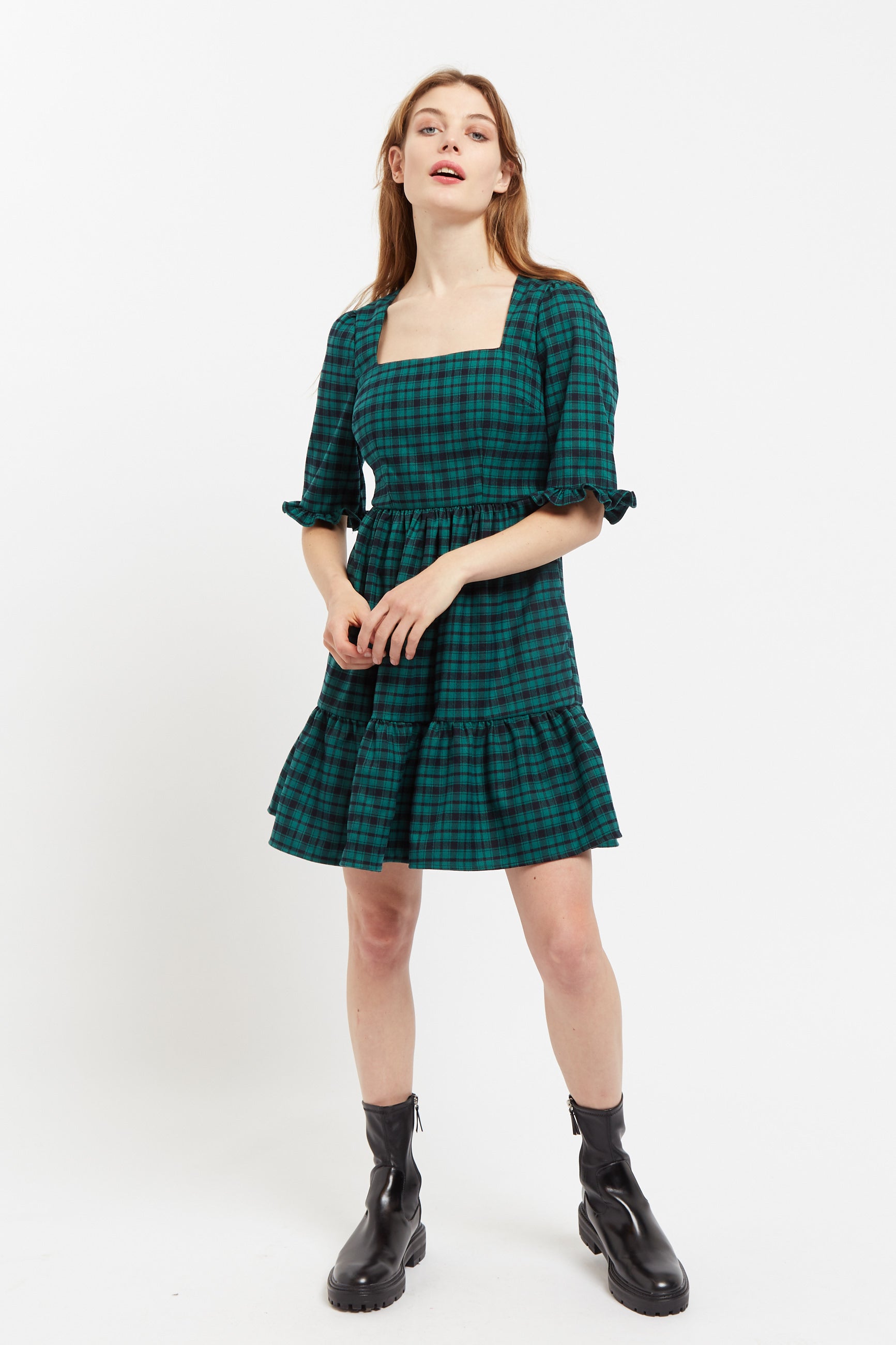 Sassa Winter Gingham Tiered Mini Dress in Green and Black