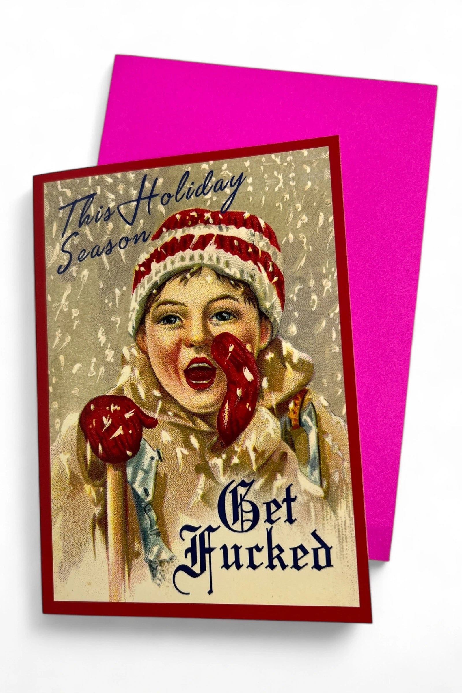 Make friends laugh this holiday season with our This Holiday Season, Get F**ked Card. Perfect for those with a sense of humour, this card may seem normal at first glance, but upon closer inspection, you'll see its cheeky double meaning. Spread some holiday cheer (and laughter) with this quirky card.