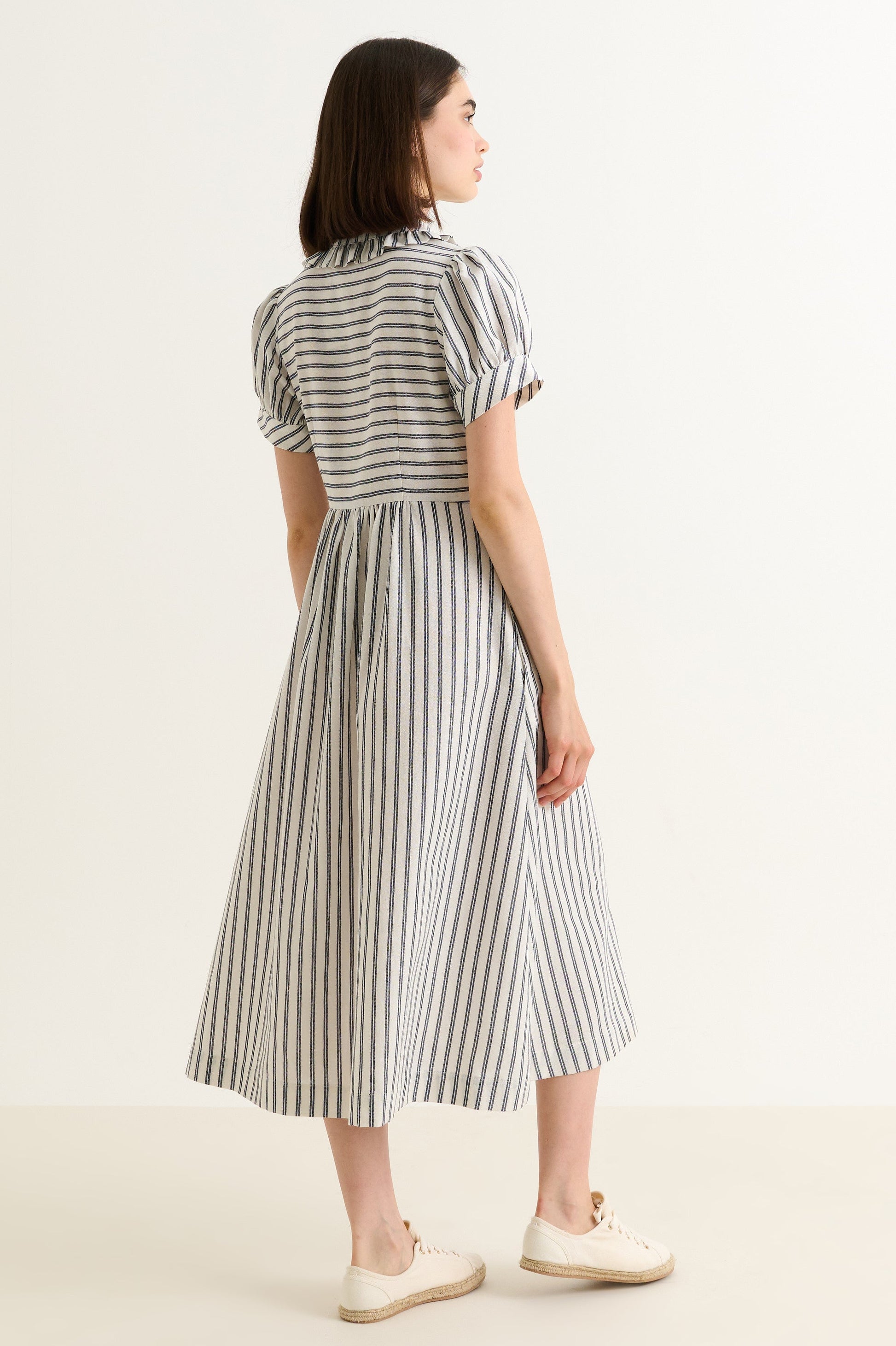 Meet your new spring-to-summer uniform. This Yassine midi dress pairs a substantial linen-cotton twill with timeless navy and white ticking stripes for understated style that actually lasts. Zip it up, admire the playful self-frill collar and puff sleeves, and you're ready—whether you're layering it now or going bare-armed in a few weeks. One dress, endless seasons.